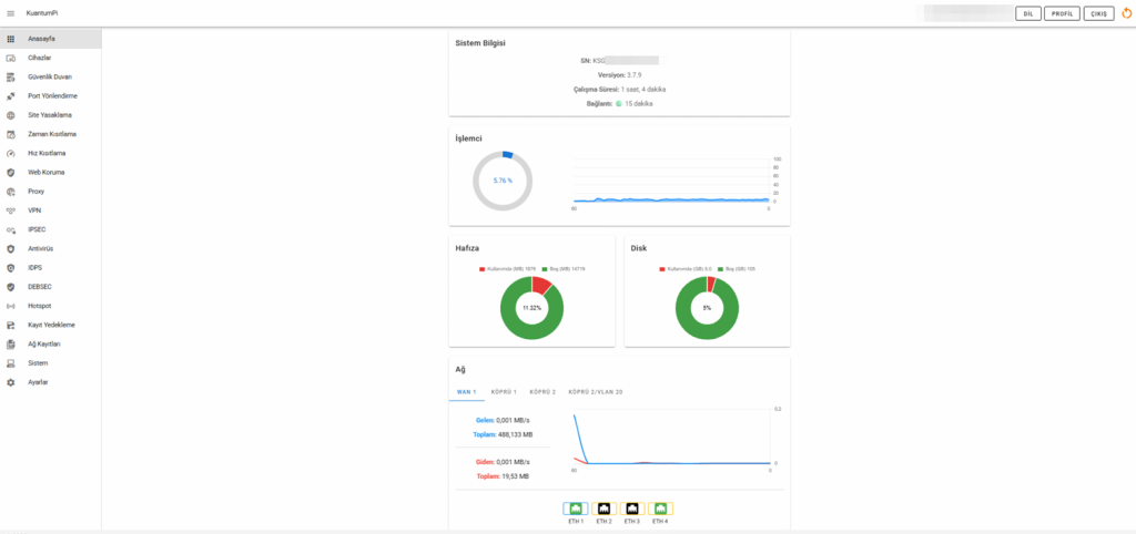 Anasayfada cihazın sistem bilgileri ile donanım ve ağ durumu kapsamlı, detaylı ve görsel olarak takip edilebilmektedir. Sistem durumu ve donanım kaynakları gerçek zamanlı olarak izlenerek olası sorunlara hızlı bir şekilde müdahale edilebilmektedir.