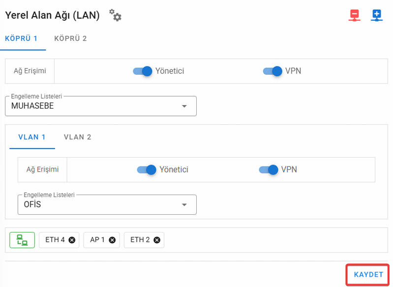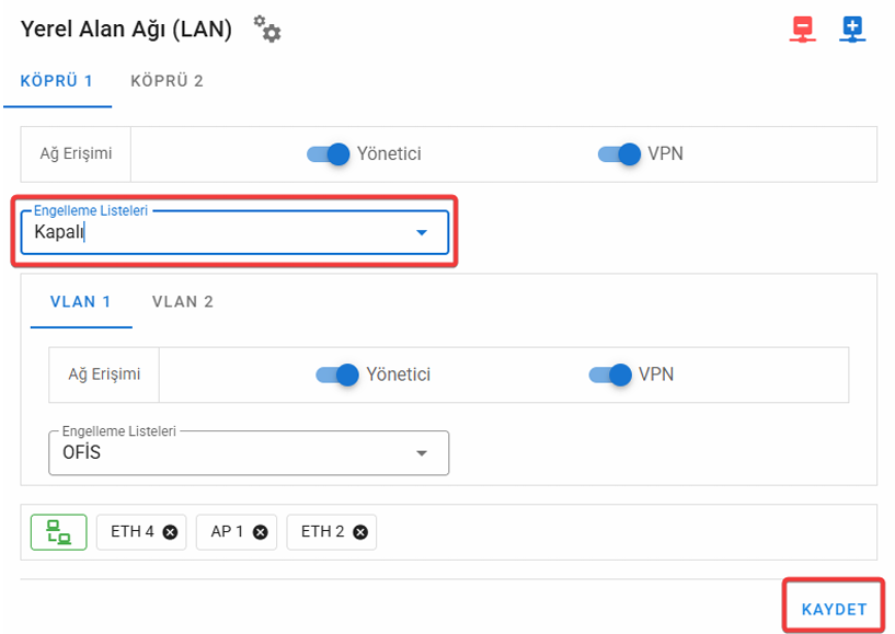 - Yerel Alan Ağı (LAN) veya VLAN altından kaldırmak istediğiniz engelleme listesinin olduğu kısımı “Kapalı” olarak ayarlanır.İstediğiniz şekilde tüm ayarları yaptıktan sonra KAYDET butonuna tıklayarak engelleme listesi veya listeleri devre dışı bırakılır.