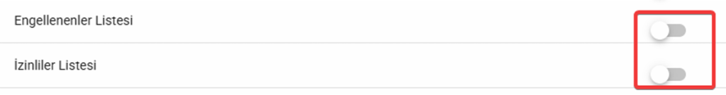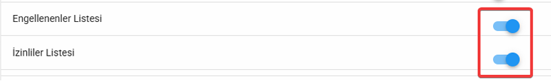 1. Engellenenler veya İzinliler listelerinin liste gruplarında dahil olması için grup içerisinde “Engelleme Listesi” veya “İzinliler Listesi” butonları aktif durumda olmalıdır.