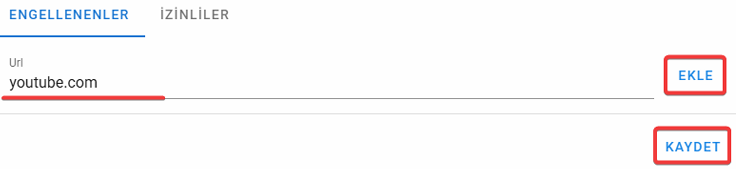 3. Erişimi yasaklanacak web sitesini veya siteleri Engellenenler kısmında URL girip Ekle butonuna tıklayarak ekleyebilirsiniz. Ekleme işlemi bittikten sonra Kaydet butonuna da tıklamayı unutmayın.