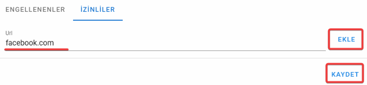 4. Erişimine izin verilecek web sitesini veya siteleri İzinliler kısmında URL girip Ekle butonuna tıklayarak ekleyebilirsiniz. Ekleme işlemi bittikten sonra Kaydet butonuna da tıklamayı unutmayın.
